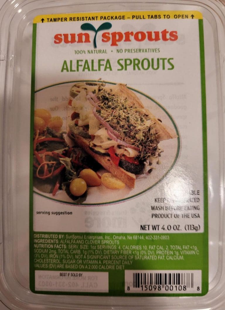 Fremont, NE– SunSprout Enterprises is voluntarily recalling two lots (#4211 and 5211) of raw alfalfa sprouts in 4-ounce clamshells, with best by dates between 12/10/22