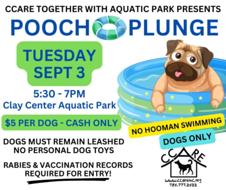 By: Ryan Duey CCARE and the Clay Center Aquatic Park are coming together for this year’s Pooch Plunge Fundraiser at the Aquatic Park. This year’s