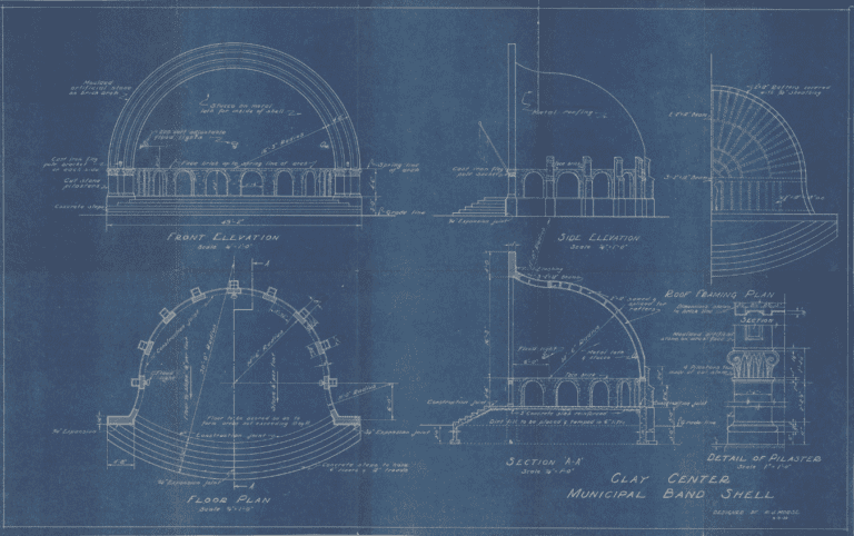 The Clay Center Band Shell was completed in 1935 and was funded by PWA. It was dedicated March 30th of that year and a plaque