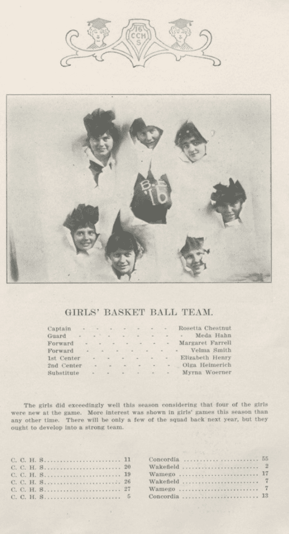 The then-CCHS girls’ basketball team in 1916 ended with a record of 4-2, with both losses against Concordia. They won games against Wakefield and Wamego.