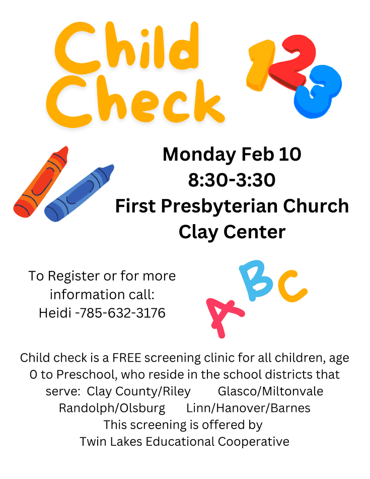 USD 379 and Twin Lakes Educational Cooperative will offer another free Child Check Screening Clinic for children aged 0 to 5 on Monday, February 10th.