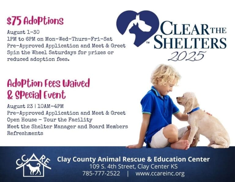 By: Ryan Duey The Clay County Animal & Rescue Education Center (CCARE) will participate in the 2025 “Clear The Shelters” pet adoption event throughout August.