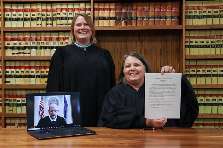 Kansas Courts News Release/Image: District Judge Robert Wonnell from his courtroom in Johnson County District Court and Chief Judge Sarah Warner of the Kansas of