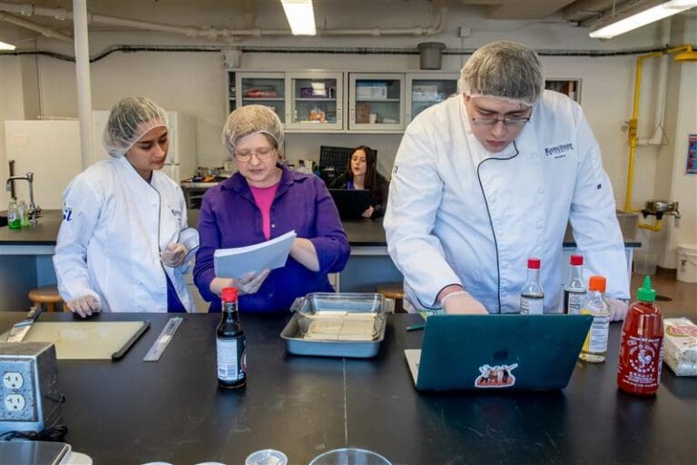 Image: Kelly Getty reviews a recipe with students in the Research and Development of Food Products course/Image courtesy K-State Kansas State University students are gaining