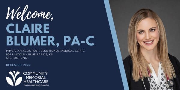 Community Memorial Health Photo Courtesy of CMH Community Memorial Healthcare is pleased to announce Physician Assistant, Claire Blumer, will join the Blue Rapids Medical Clinic
