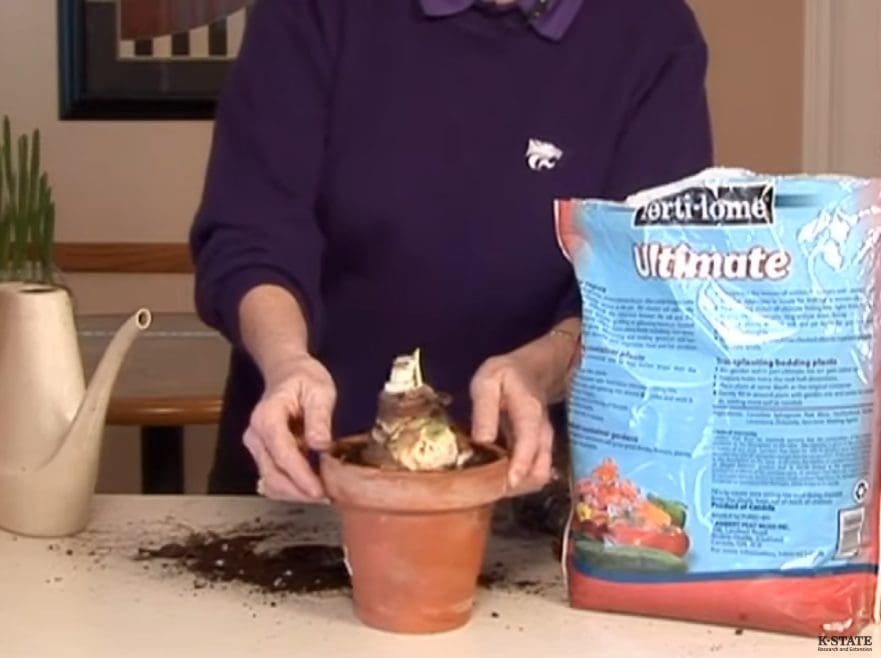 - Hold the bulb so the roots hang down into the pot and add potting mix.