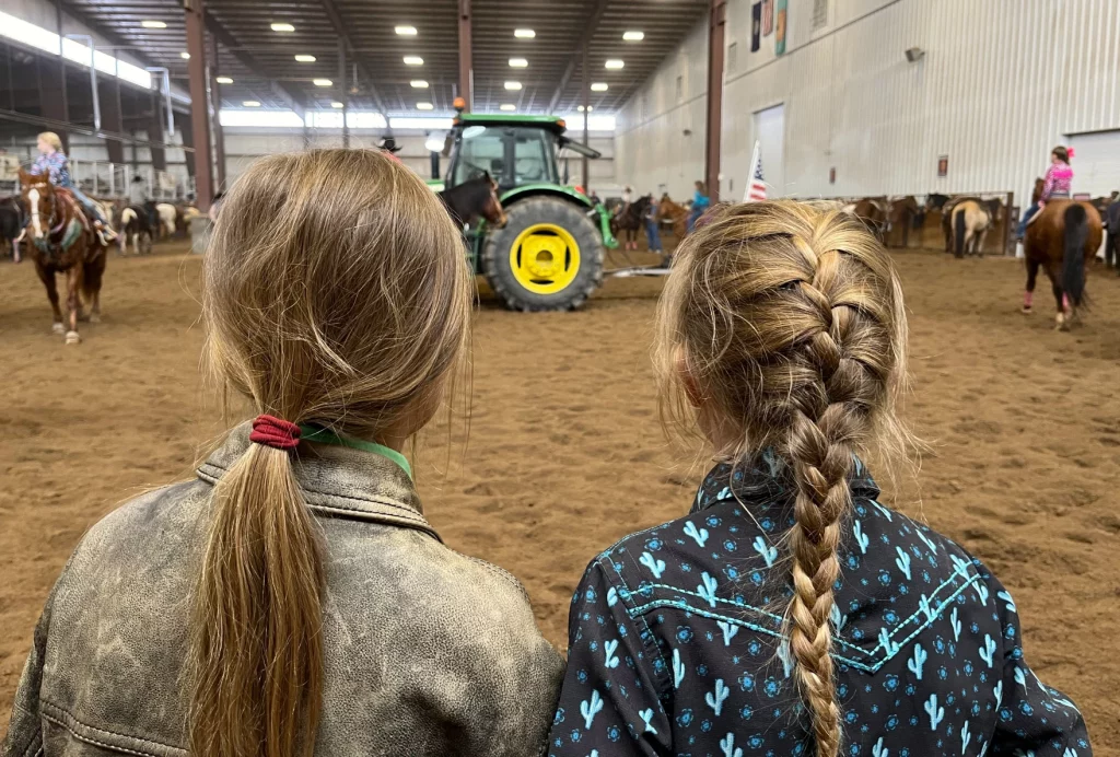 In the horse warm-up area, nine-year-old friends Paisley Davis and Braylin Barratt offer a tour of the bridles and stirrups strapped to their four-hoofed friends. The pair live a few hours apart in southern Colorado, so they’re making up for lost time here.