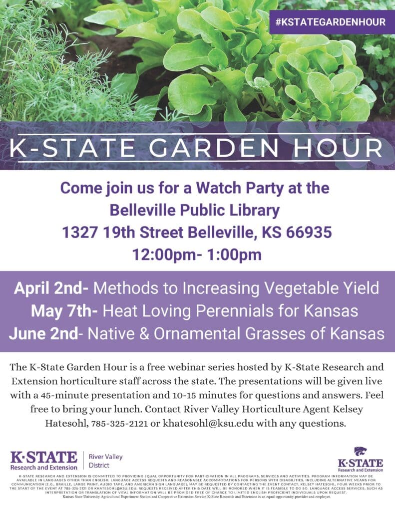 Join the River Valley District for a fun, new event! Kelsey Hatesohl, River Valley Horticulture Agent is partnering with the Belleville Public Library to host a watch party for the K-State Garden Hour. The K-State Garden Hour is a free webinar series hosted by K-State Research and Extension horticulture staff across the state. Kelsey will be showing the webinar live in the library meeting room (1327 19th Street, Belleville, KS 66935) and will be there to answer any horticulture related questions.