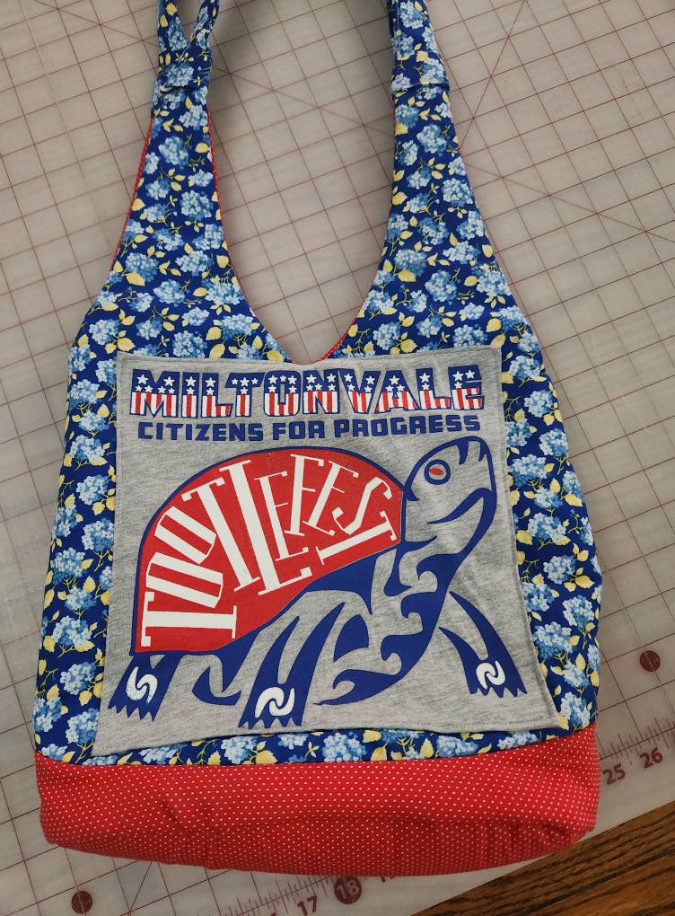 The youth class prize was awarded to Tayla. Monier said, “She selected fabrics to coordinate with a t-shirt to construct a cute and very usable bag. The floral print is so cute mixed with the t-shirt and red pin dot fabric. The bag is lined with two pockets to keep the contents organized.”