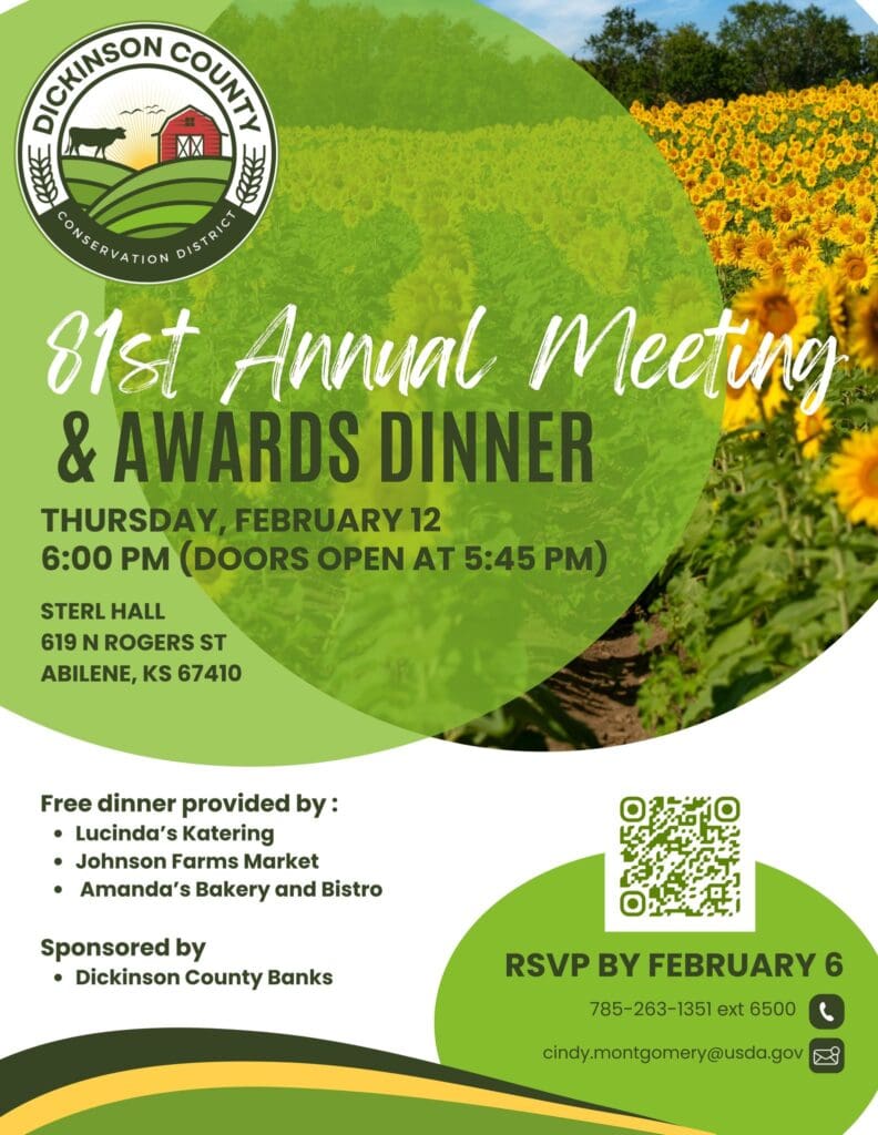 The Dickinson County Conservation District will host its 81st Annual Meeting and Awards Dinner on Thursday, February 12th, at Sterl Hall in Abilene. The evening will begin at 6:00 p.m. with a complimentary catered meal by Lucinda’s Catering, with homemade pie by Amanda’s Bakery and Bistro, and Johnson Farms Market for dessert.