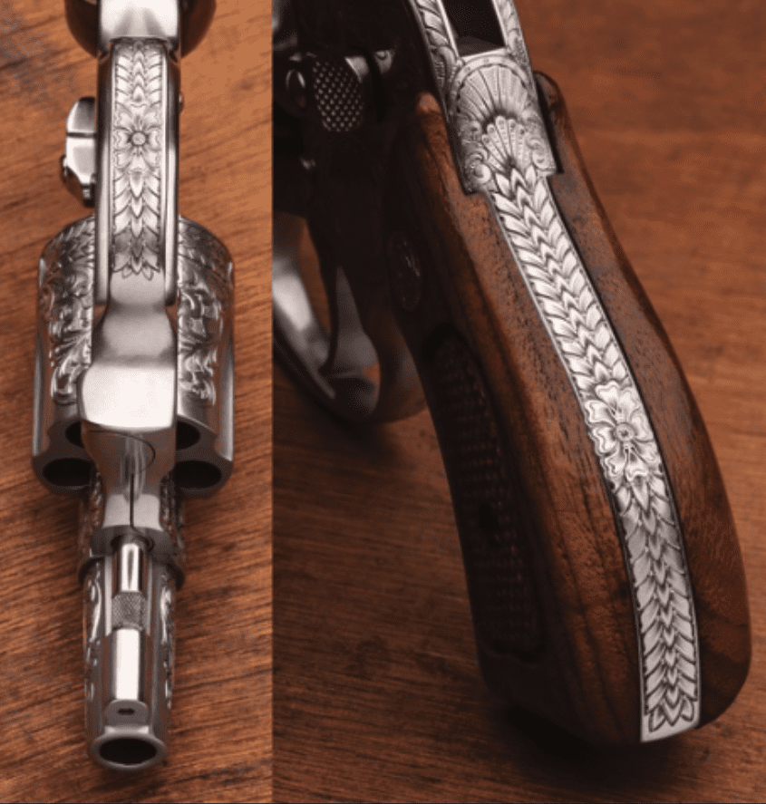 He also offers scenes, gold inlay, or custom portraits in addition to American scrollwork. It’s a style he chooses to continue due to its longstanding history with S&W.
