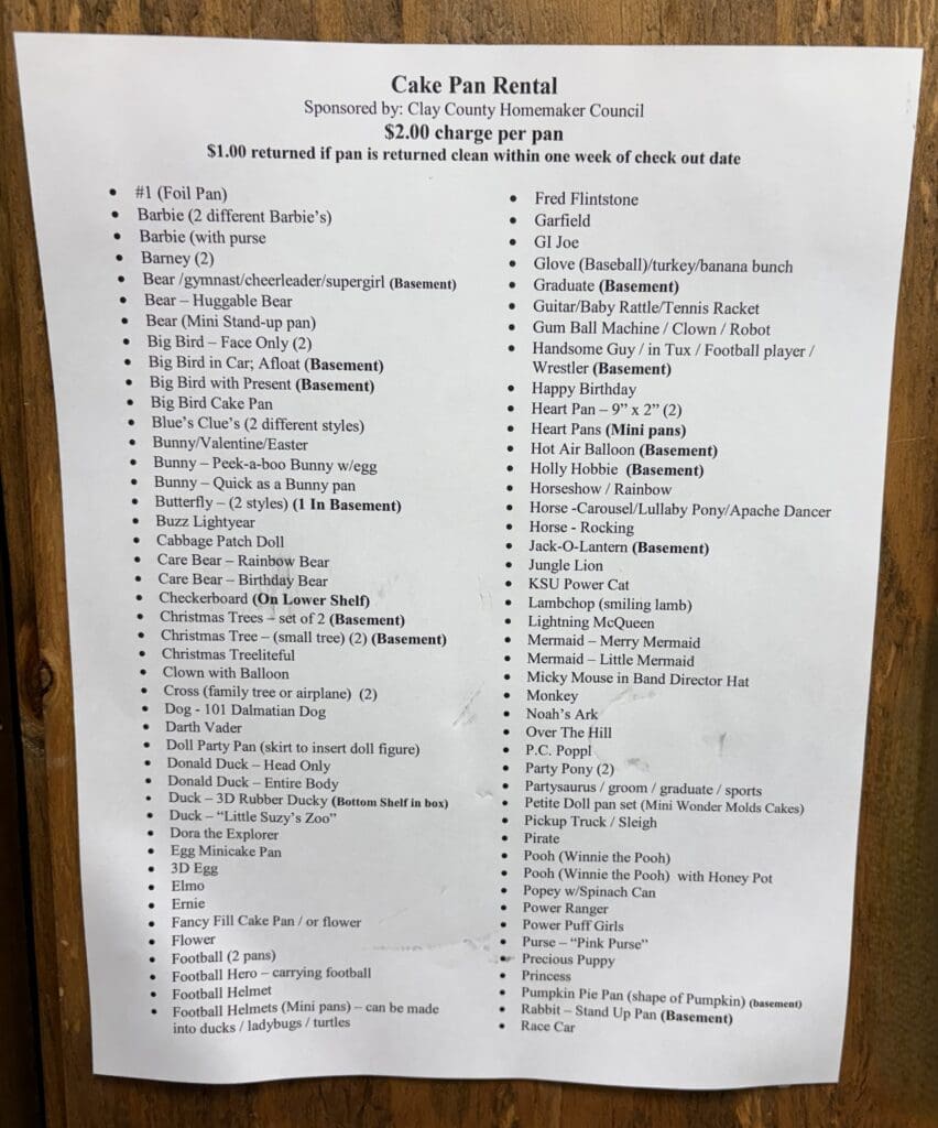 For a cash deposit, community members can check out the pan of their choice. They’ll get their deposit back when they return the pan. In the Clay County Extension office, pans can be borrowed with a $2 deposit. Upon returning the pan, the borrower will get $1 back while the other $1 goes to the local 4-H.
