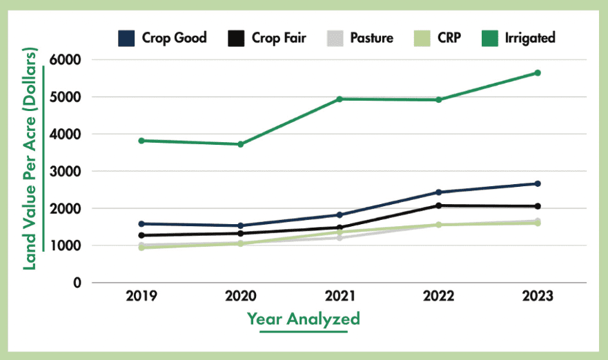 In addition, these values are determined by an eight-year rolling average, on a two-year delay. For instance, 2025’s ag land values are prepared from 2016-2023 data.