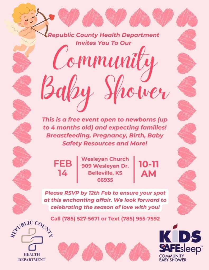 The Republic County Health Department invites all Republic County expectant families and families with babies from newborn to 4-months-old to attend the Community Baby Shower from 10 a.m. to 11:30 a.m. February 14 at the Wesleyan Church in Belleville.