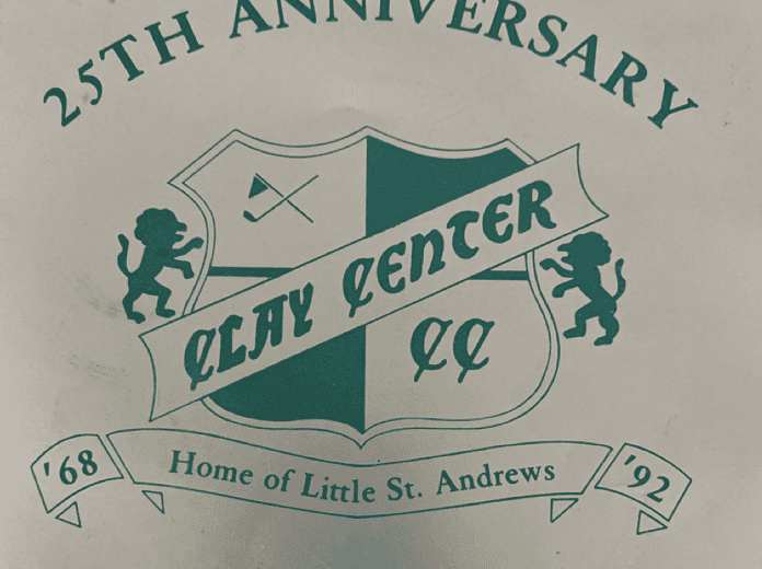 Top: The original Clay Center Country Club clubhouse was a refurbished farmhouse that notably housed cattle in its basement. The structure was placed under a controlled burn in the early 90s so a new clubhouse could be erected in its place. The latter was completed in April of 1994. Middle: The crest for the Little St. Andrews tournament was designed by Margaret Hammel in 1967. The tournament ran for 52 years, bringing in big-name golfers. Only three Country Club members could compete and they had to qualify. Ray Wyatt was the event’s winningest competitor, taking the title four consecutive times, 1981-1984, and again in 1990. Left: Spectators gather to watch competitors tee off in the early 90s.