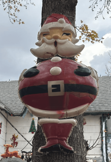 The antique Santa that is hung at the house today was once displayed on the Courthouse Clock Tower. Greg said it hung beneath the clock face. Johnny, too, would hang these Santas annually. However, as its grown brittle, this is its last year on display. Another throwback of the town is the glowing lantern that hangs above the street, which formerly hung downtown.