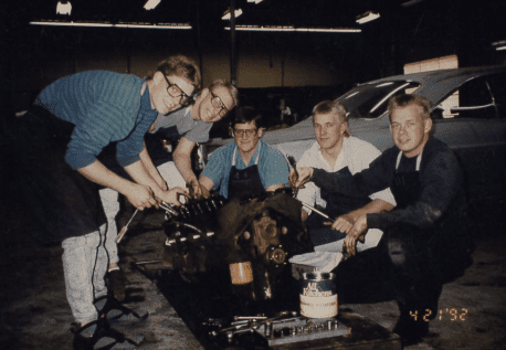 Unruh’s power mechanics class, April 21, 1992. Left to right: Jeremy Crimmins, Eric Gepner, Jeff Germann, Corey Pfizenmaier, & Bob Turner.