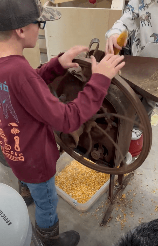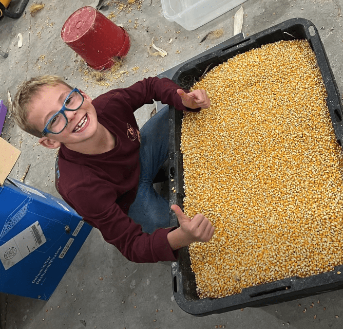 Once the corn was ready, Rhett picked each ear by hand, with the help of his two younger siblings, who he hired for the project. Then it had to be shucked and shelled the ears by hand.
