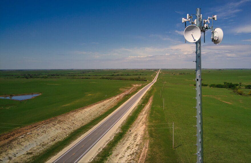 Ideatek / Ideatek: An Ideatek fixed wireless tower stands next to a road in Chase County just west of Elmdale. Towers like this send out a wireless signal that can connect any home within the line of sight and link farm equipment to the internet for precision agriculture applications.