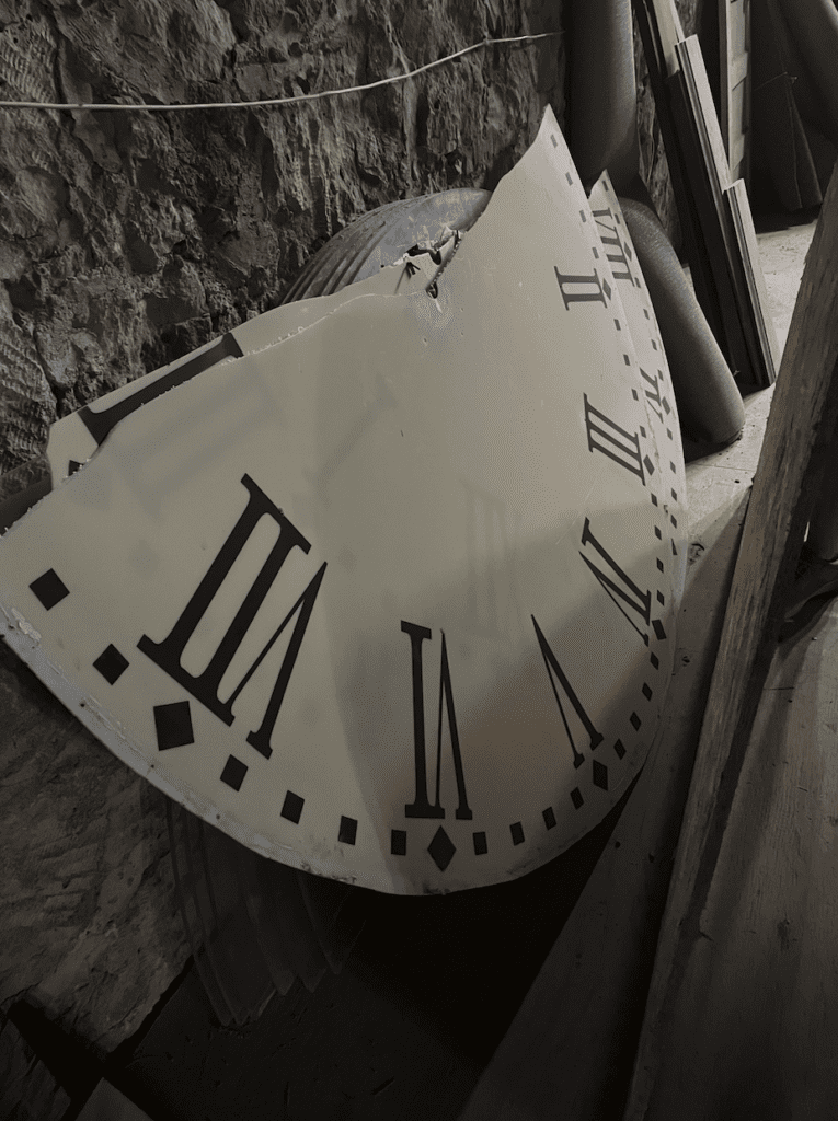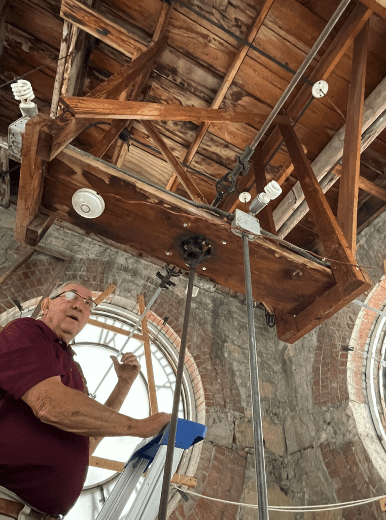 Originally, the clock faces were kept in time by weights, Knoettgen said. Then electricity was added, running wires to all four clocks that are manned by a single machine, #1207 made by the Set Thomas Clock Co. in 1903. (It’s likely that this is when the clock project was completed.) The clock was reset by hand, with a staff member climbing handmade wooden steps at a set interval. Adding power eliminated that job. The clock mechanism still sits in a large wooden box that’s accessed by a door.