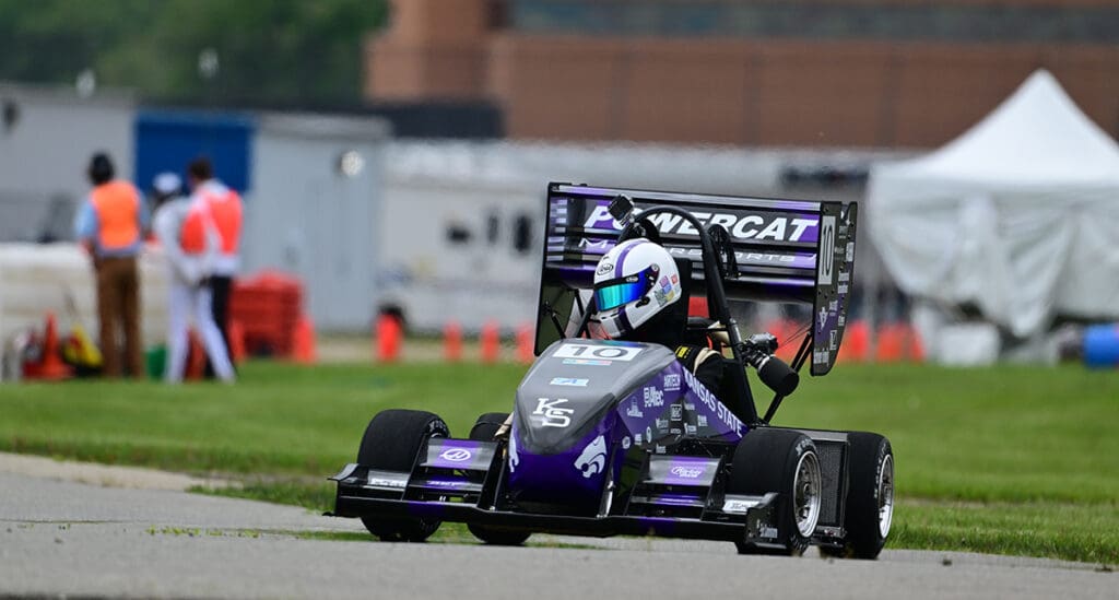 At this year’s Formula SAE Michigan competition, K-State placed fourth out of 107 teams—its best finish in more than 25 years. The team topped all nine Big 12 schools, with standout performances in both dynamic and static events. Drivers earned third place in the endurance race, while the business presentation team placed third for the first time ever.