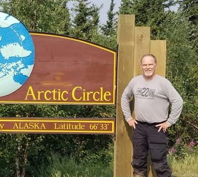 The motorcycle rider is arriving at the Arctic Circle. He made this grueling trip to raise awareness of the tragic epidemic of veteran suicide.