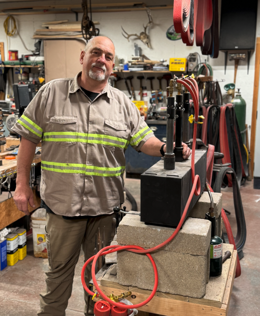 Next, he purchased a forge and began making more and more knives. Almost every weekend is spent working on the project. While he and Janet travel to craft shows to sell their wares – his knives and her crochet items. During the week he’s traveling for his full-time job: a reliability specialist with Pepper Maintenance Systems where he tests electrical panels with infrared equipment, searching for issues.