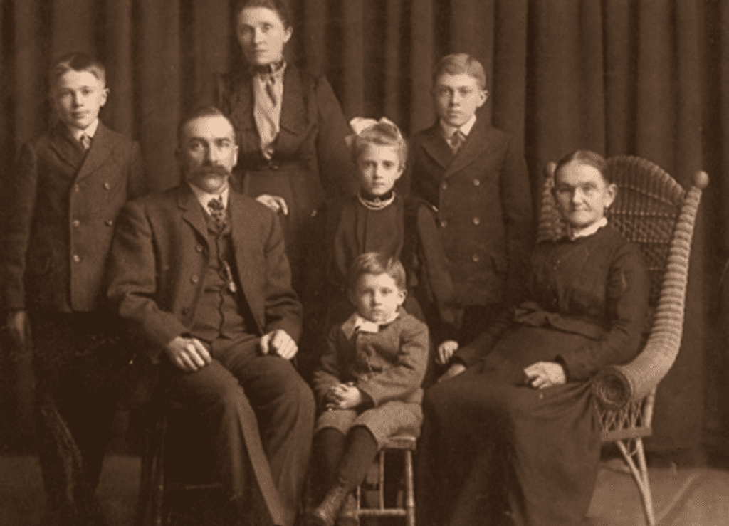 Pictures: Top: August Gottlieb in 1890; Below: from left to right: George, August, Dora, Walter (front), Dorthea, Oscar, and Johanna