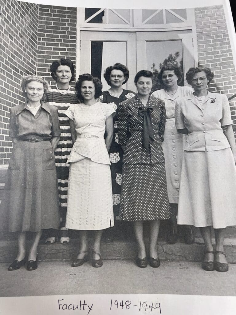 Photos: Top left: Georgia Hemphill in her retirement announcement, April of 1971. Lower left: Hemphill as a junior in high school in 1924. Above: Lincoln School faculty picture from the 1948-1949 school year. Front row, left to right: Irene Erickson, 1st grade; Barbara Cline, kindergarten; Fern Downs, 3rd grade; Hemphill, 6th grade and principal; back row left to right: Mildred Esslinger, 2nd grade; Wilma Rowland, 5th grade, Edna Farren, 4th grade.