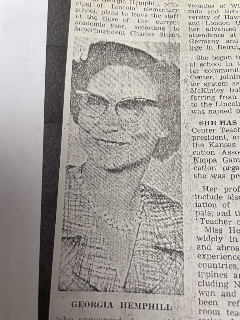 Georgia W. Hemphill was the longest-serving principal at the then-new Lincoln Elementary School in Clay Center. Completed in 1939 across 7.1 acres (six total lots of land). Hemphill joined the staff in 1942 as both a sixth grade teacher and principal.