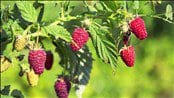 Red raspberries and thorny blackberries