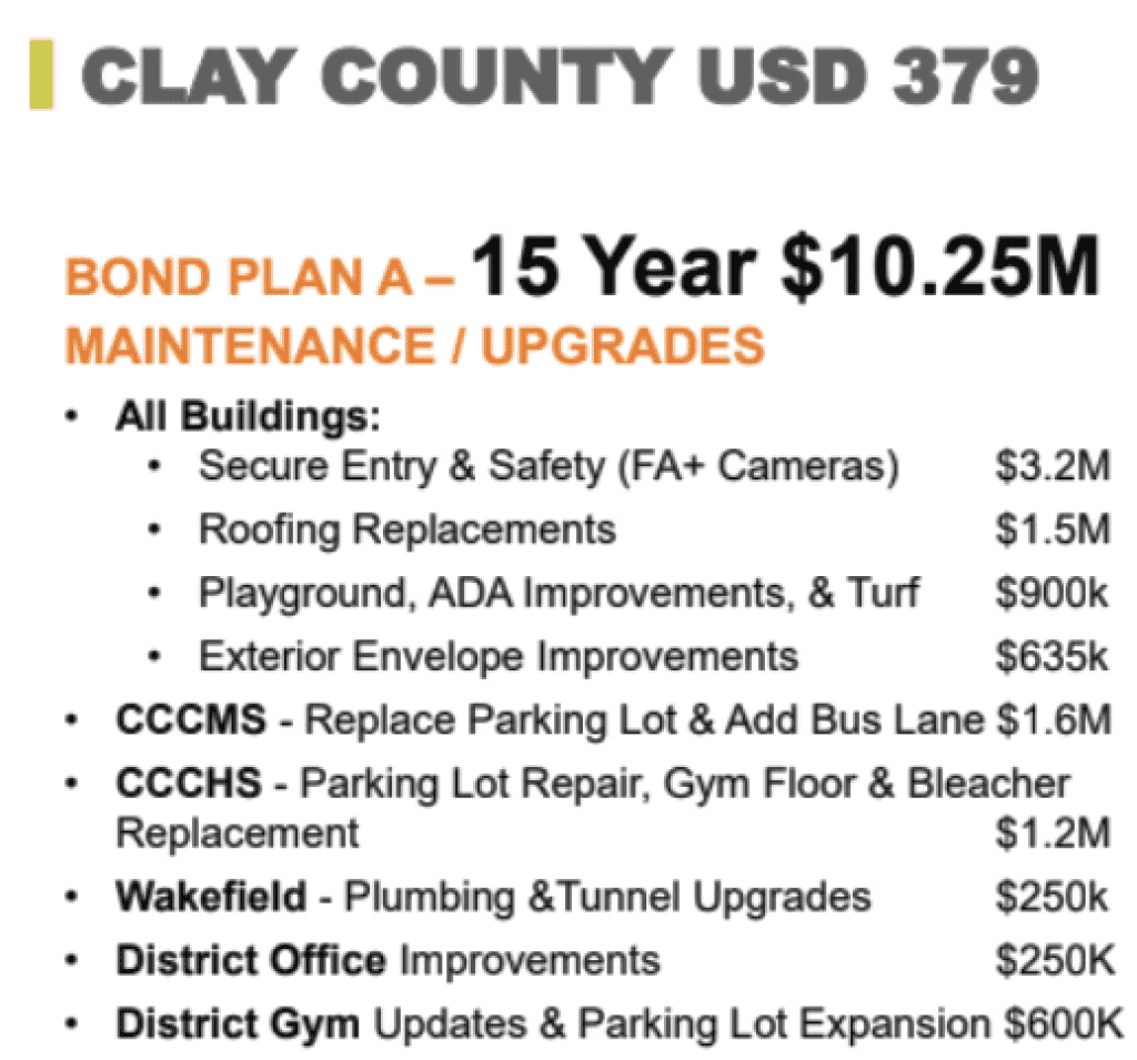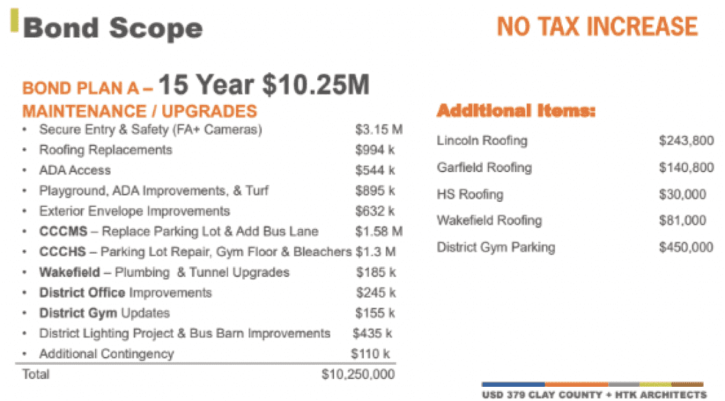 The USD 379 Board of Education held a special meeting on December 1st to discuss the upcoming bond issue. The Board voted to pursue Bond Option A or the “maintenance bond,” which is a $10.250 bond over 15 years, rather than a consolidation option.