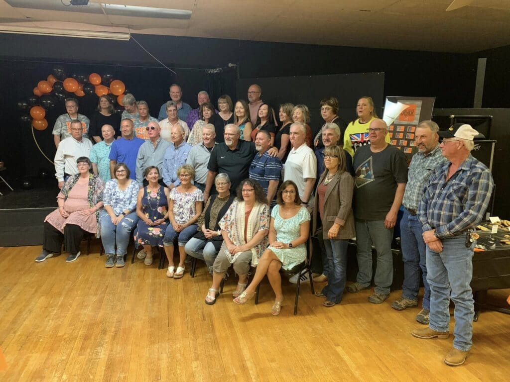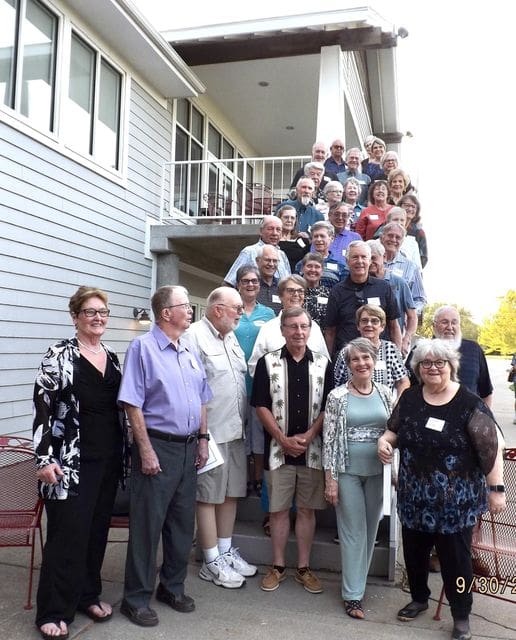 Most of the reunion attendees are pictured on the Country Club staircase. Those participating in weekend activities were: Lynne Anderson Knowlton, David Bauer, Diana Bauer Williams, Jane Bender Sherbert, Bill Bertrand, Phil Francis, Sam Gibbs, Ken Gimple, Rex Halepeska, Bob Hammond, Max Hanson, Vicky Hauserman Harris, Roseann Hileman Thornberry, Veryl Klein, Karen Kretz Hauserman, Jane Larson McGuirk, Gary Mailen, Mary Jane Mailen Patterson, Mary Mason Beatty, Ann McIntosh Adrian, Kathy McKee Willis, Palmer Meek, Sue Ann Neill Young, Dennis Olson, Lonnie Paquette, Ron Riechers, Charlie Roebke, Lyle Ross, Dennis Sadler, Frieda Schoneweis Nichols, Bonnie Fyfe Spurlock, Bryan Spurlock, Jan Summers Gibbs, LaVonne Tillman Hartner, Chylene West Pender, and Lyle Worley.