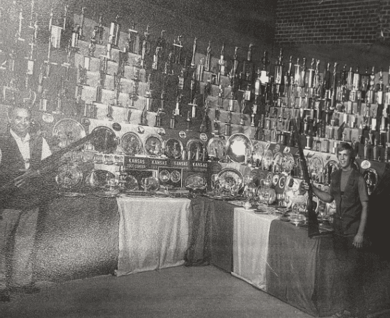 Pictures: Top: Phil Frigon receiving a Golden West Grand award, an annual event by the Amateur Trapshooters Association. He was the Kansas All-Around Trapshooting Champion in 1974 with 388 out of 400. Above: In the ‘70s, Frenchy and Phil took their trap shooting awards to the armory for display.