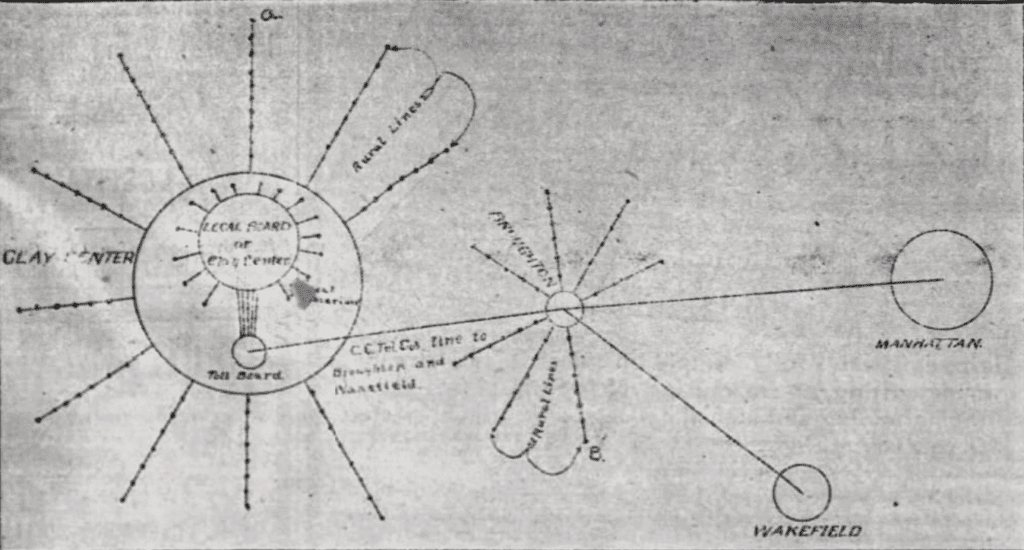 In 1907 the CC Telephone Company published a series of letters and facts about a dispute between the exchange in Broughton. Allegedly, the Broughton exchange accused them of excess bills and wanted 5¢ paid for their own telephone operator. The Clay Center location also published a map of how the exchange operated at the time.