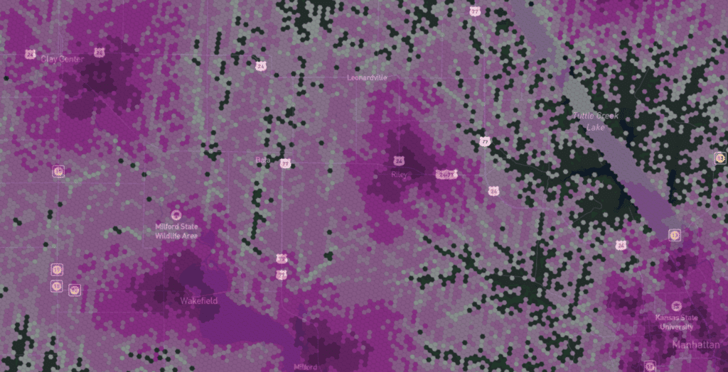 Top: The Clay Center Telephone Company published their coverage map in 1907. Bottom photo: coverage map of one of four wireless services that encompass the area. Data from the FCC.