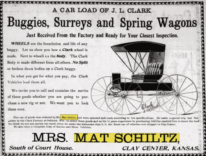 Anthony and Mat sold wagons and buggies. Mat died in 1904, which the paper listed as “the summons to eternity.” His widow, Lizzie Esslinger, continued the Mat Schiltz Buggy and Implement Business. She was reported to be the “first white child born in Washington County” in 1860. Her parents settled at Parson’s Creek two years prior to her birth.