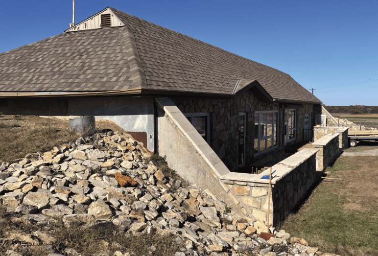 “He said there was no way that would work because the earth would cave it in,” Linda said. Instead, the rear of the home would need a 10-foot concrete wall supported by four-foot buttresses. They sit perpendicular to help support the wall through the weight of dirt. Two more sides of concrete were poured, with the exception of the front of the home, which is above-ground and covered in limestone.