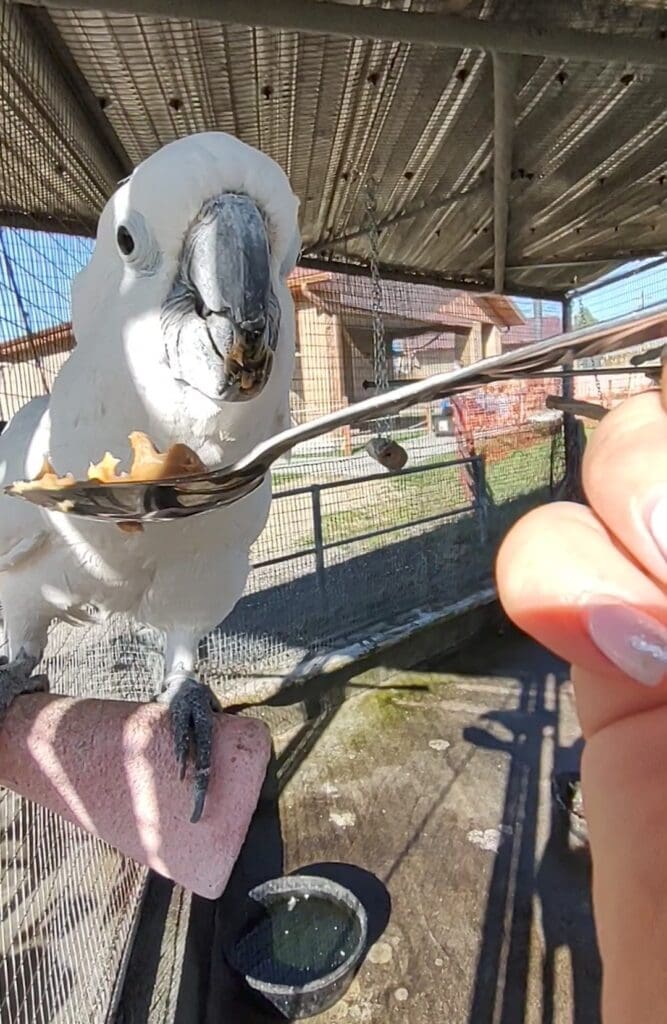 The parakeets in the aviary are the smallest residents. They like to play in the dirt and chew on bird-safe plants zoo employees provide for them. The items they really enjoy are cardboard boxes and newspapers they can tear to pieces and anything metal and shiny that makes noise and is durable enough they can’t pierce it with their strong beaks. Sorell said she is building some new toys for them but says the interactions the birds have with visitors to the aviary also gives them a lot of enrichment.