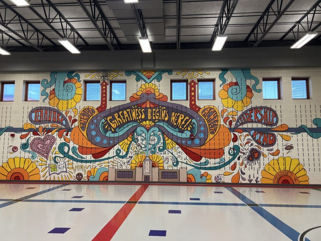 Evan Brown, also known as Doodle Dood completed the mural while the kids were on spring break last week. And this morning all of the kids were hovering at the door in anticipation of the reveal of their newest art work.