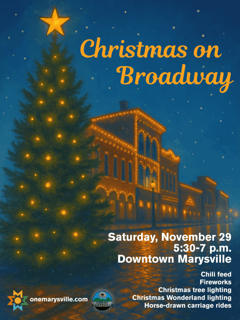 OneMarysville Photo Courtesy of OneMarysville Marysville will officially kick off the Christmas season with Christmas on Broadway Saturday, November 29, from 5:30 p.m. until 7