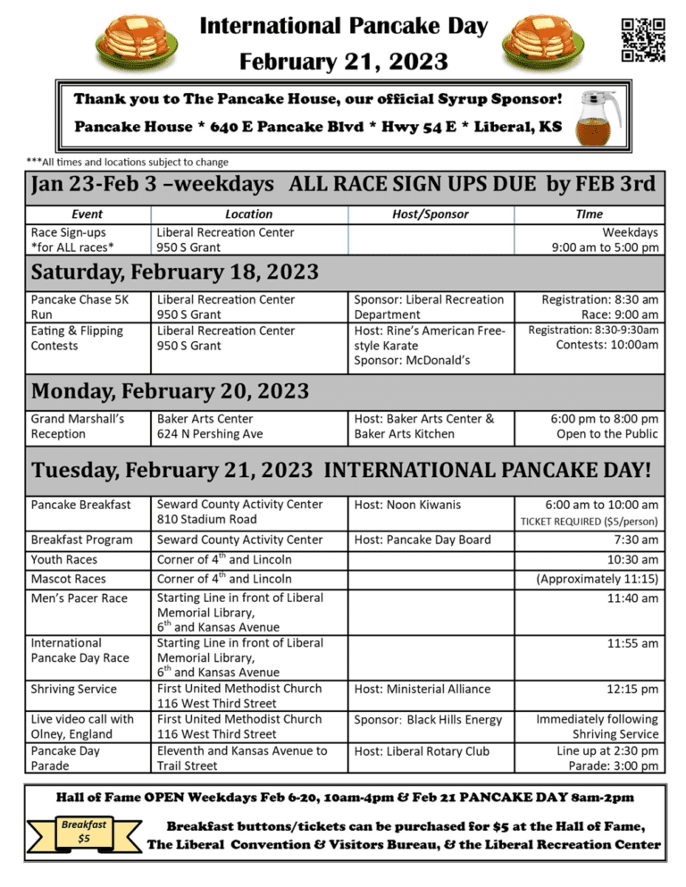 Liberal, KS-The International Pancake Day Race, a tradition between Olney, England and Liberal, KS will take place, February 21st, 2023. This is the 74th year