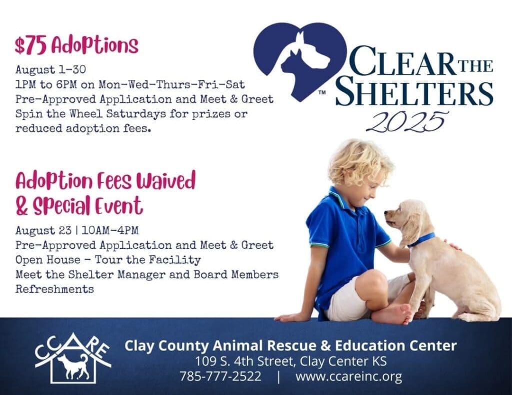 The Clay County Animal & Rescue Education Center (CCARE) will participate in the 2025 “Clear The Shelters” pet adoption event throughout August. This national initiative has helped over one million pets find new homes since its inception in 2015.