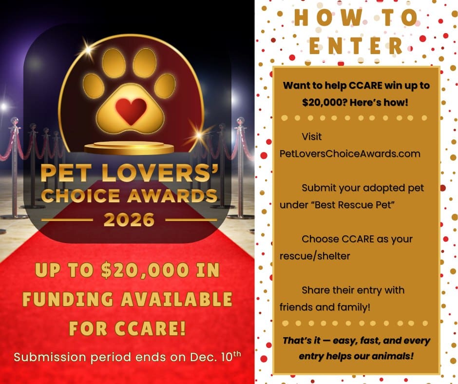 Throughout December, pet owners who have adopted a pet from CCARE are encouraged to submit their pet in the ‘Best Rescue Pet’ contest at PetLoversChoiceAwards.com. While submitting your rescue pet, be sure to select CCARE as your rescue shelter.