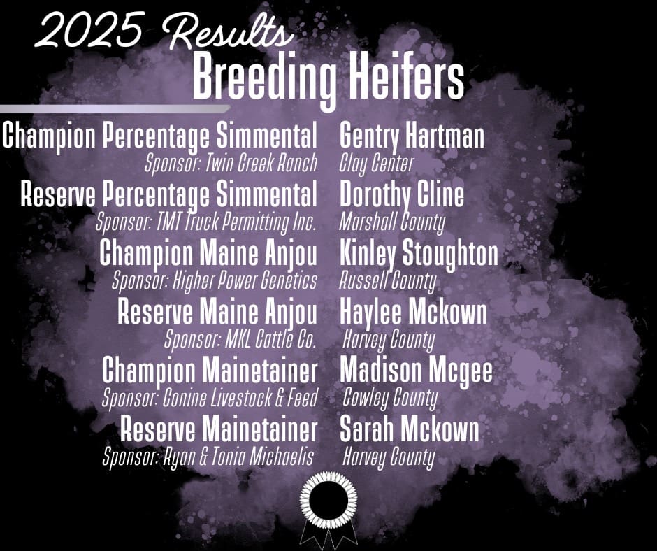 CCCHS Junior Gentry Hartman, daughter of Kevin and Audie Hartman, from Clay Center, came away a champion at the 2025 Kansas Junior Livestock Show (KJLS) in the inaugural Supreme Female Drive Division that took place October 3rd through the 5th. Hartman showed in the ‘percentage Simmental heifer class,’ with Dorothy Cline of Marshall County taking reserve champion.
