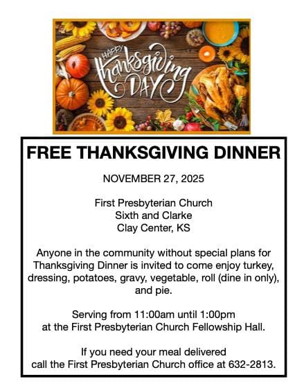 The Clay Center First Presbyterian Church will soon prepare for its annual Community Thanksgiving Dinner, set for Thursday, November 27th, from 11:00 a.m. to 1:00 p.m. in the Fellowship Hall.