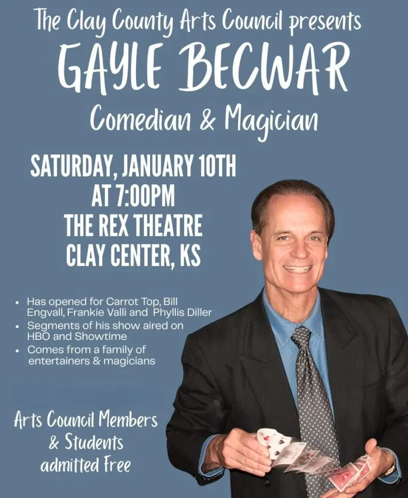 The Clay County Arts Council’s first program of 2026 is set for this Saturday, January 10th, as Comedian & Magician Gayle Becwar will perform at the Rex Theatre in Clay Center at 7:00 p.m.