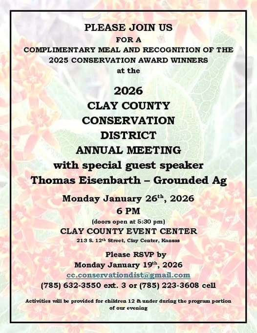 The public is invited to the Clay County Conservation District’s 2026 Annual Meeting on Monday, January 26th, at the Clay County Event Center in Clay Center, beginning with a complimentary catered meal at 6:00 p.m.