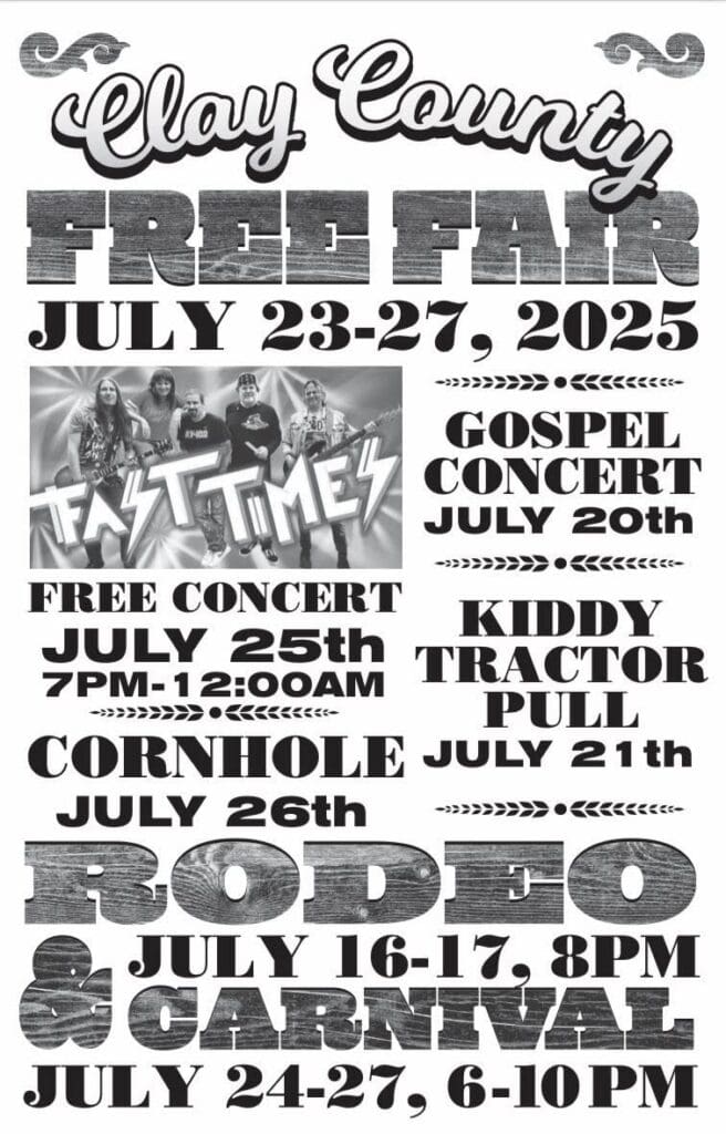 The annual Clay County Rodeo will again take place the week before the Fair on July 16th and 17th. The Fair is a special time, when the community comes together to socialize, eat good food, and enjoy all the activities the Fair has to offer.