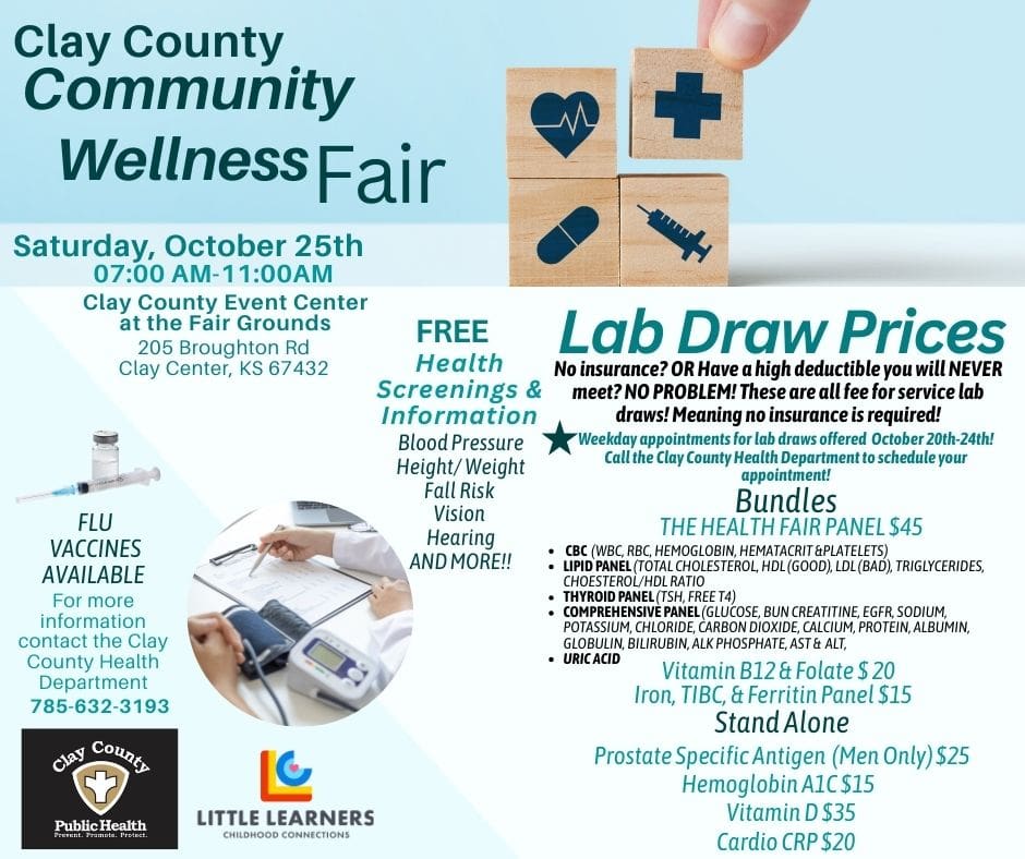 The Clay County Health Department (CCHD) and the Health and Wellness Advisory Committee at Little Learners will host a Community Wellness Fair on Saturday, October 25th, at the Clay County Event Center. The Fair will run from 7:00 a.m. to 11:00 a.m.